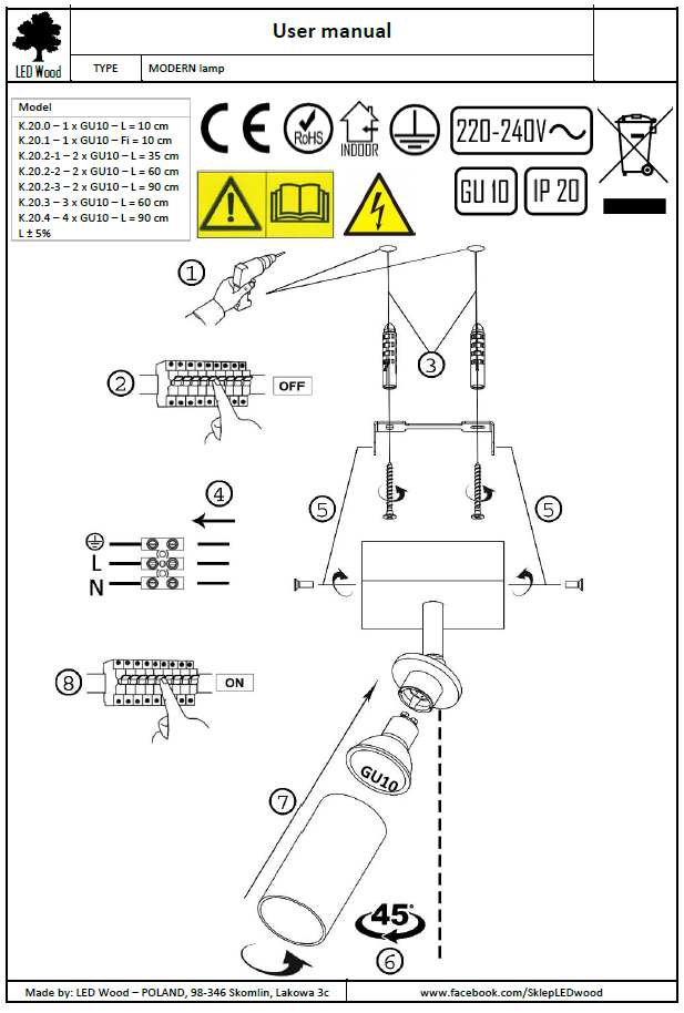 - Źródła światła - 3x żarówka GU10 (brak w zestawie)